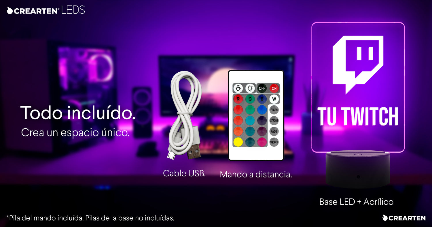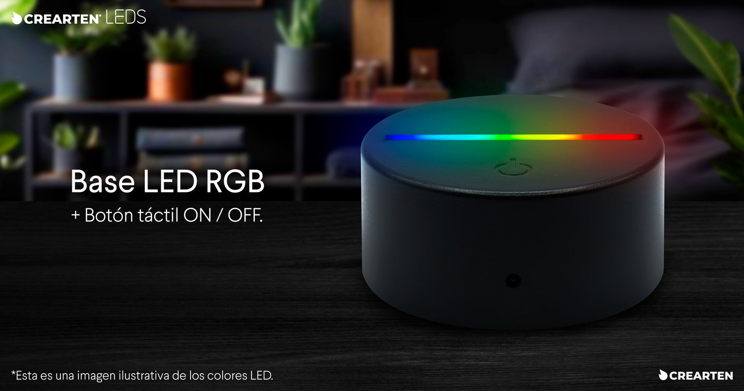 La lámpara incluye una base LED RGB con 6 colores estáticos, alimentación por pilas o USB y un botón táctil de encendendido y apagado.