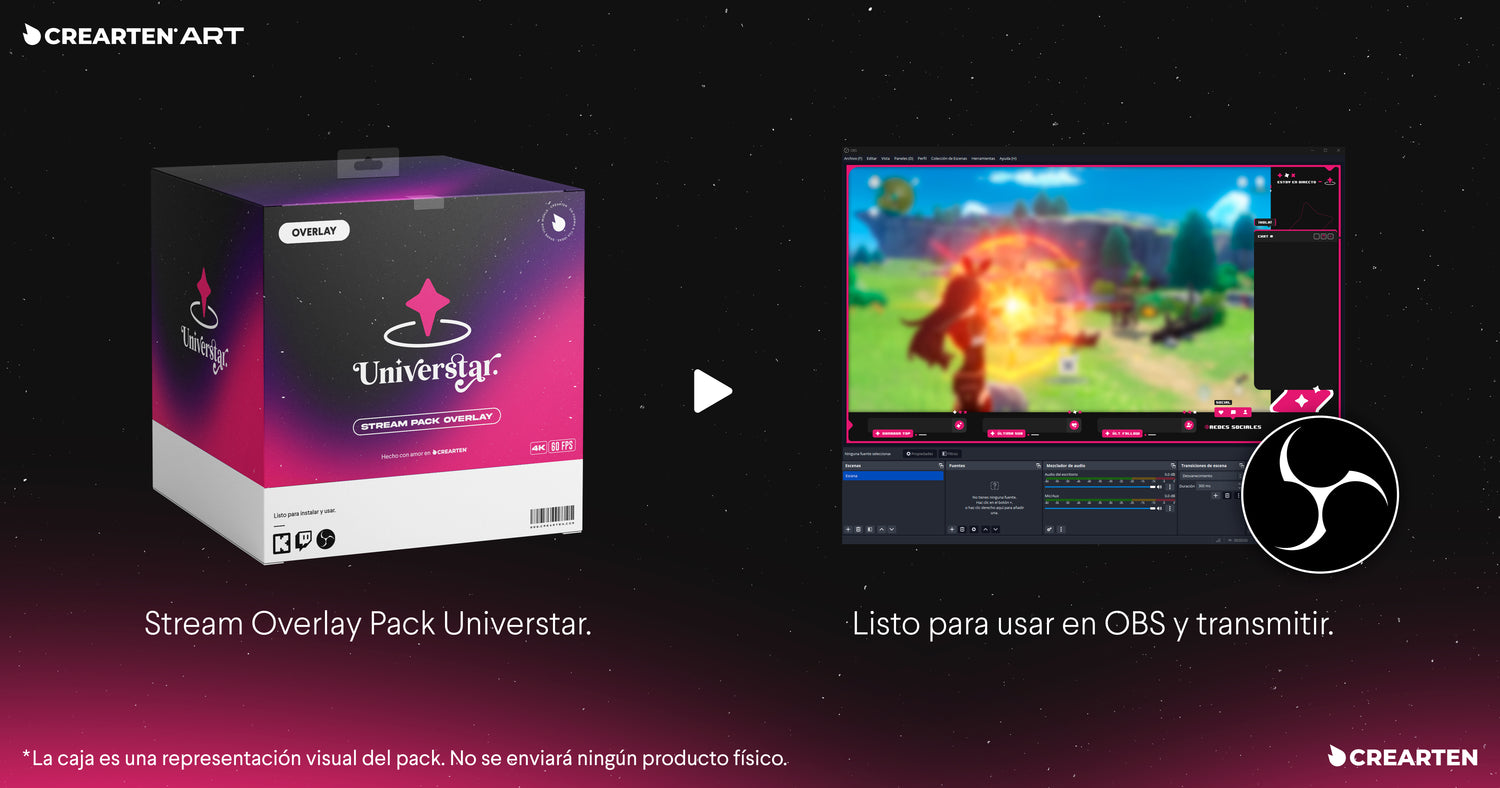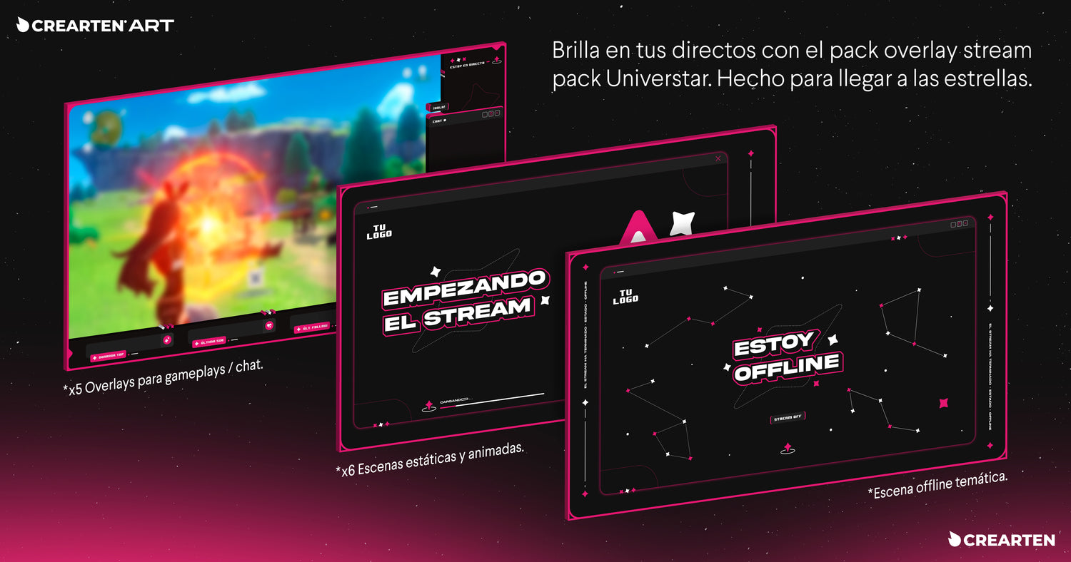 Haz que tus streams tengan un estilo totalmente único con el pack de overlays de Universtar. Hecho con amor en Crearten para que tus directos brillen con luz propia.